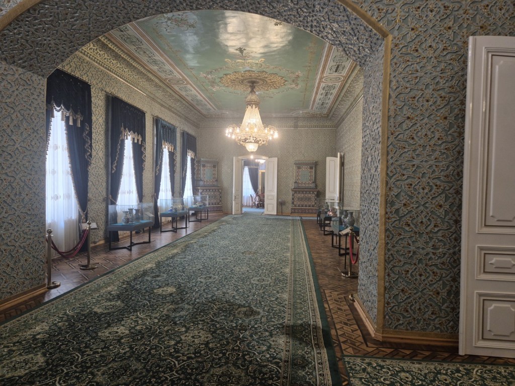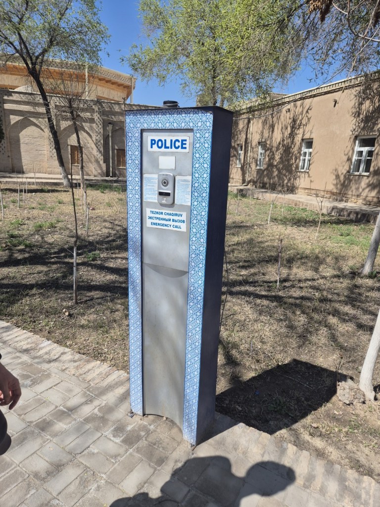 Etrafta biraz turladıktan sonra iç kaledeki “Teahouse Farrukh” çay bahçesindeki sedirlere serilip birer kahve ve bir tane de tadımlık özbek baklavası söyledik. Özbek baklavası değişik bir şey incirli gibi fena değil ama baklavadan çok tarta benziyor (Hesap 110.000 SOM=8 USD). Önce dış kale ve şehir içi yerleri gezip ikinci günde iç kaleyi bir rehber ile gezmeyi kararlaştırdık. İlk durağımız Nurullabai Sarayı. Pek çok yerde olduğu gibi buranın da önünde“police emergency call” butonu olan bir istasyon var. Turist güvenliği açısından son derece rahat bir yer zaten. Bir sıkıntı yaşama ihtimaliniz çok düşük. Sarayı gezdik ama pek de bir şey anlamadık. Müzecilik açısından bir hayli zayıf çünkü başı neresi sonu neresi anlamıyorsunuz yönlendirmeler açıklamalar ya yok ya da eksik. Bazı gezdiğimiz müzelerde pek çok şeyin İngilizcesi yazılmamıştı örneğin. Buradan bir yerleri gezmeden çıkmış olmamız bile mümkün. Bu saray Hive Hanı 2.Muhammed Rahim Han tarafından oğlu Asfandiyar Han için yaptırılmış (1912) ve İsfandiyar Han burada ikamet ederek resmi kabul salonu olarak kullanmış.